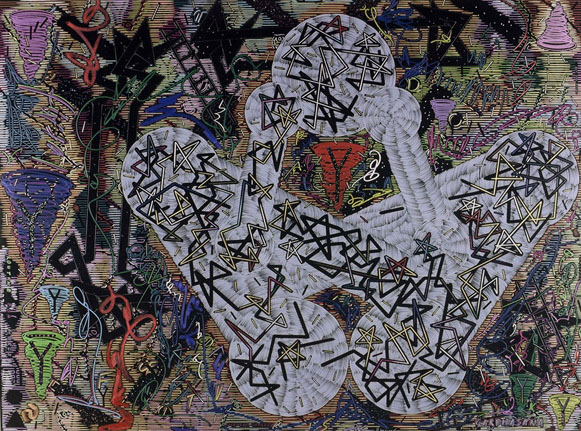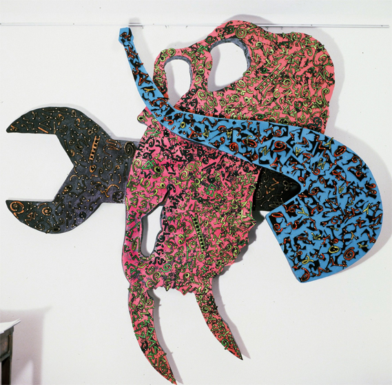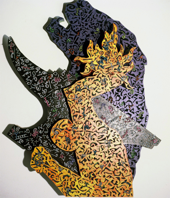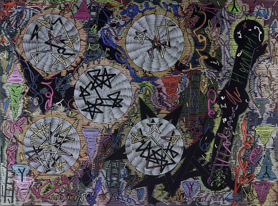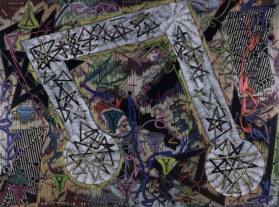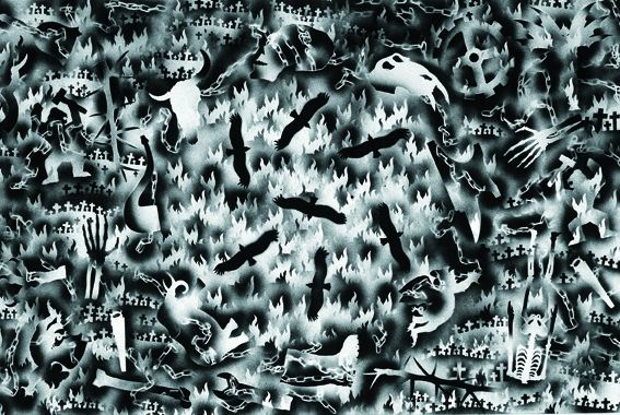 Exhausted by the material and optical complexity of the Stacked Relief works Payne decided to move to simple materials, in this case hand cut paper stencils and matt black spray can paint. Much of his iconographic tokens remain in these works however he expands the industrial motifs to include medieval symbols. The spatial geography implies the viewer inhabits both a conventional and ariel prospect position in a chaotic apocalyptic landscape.