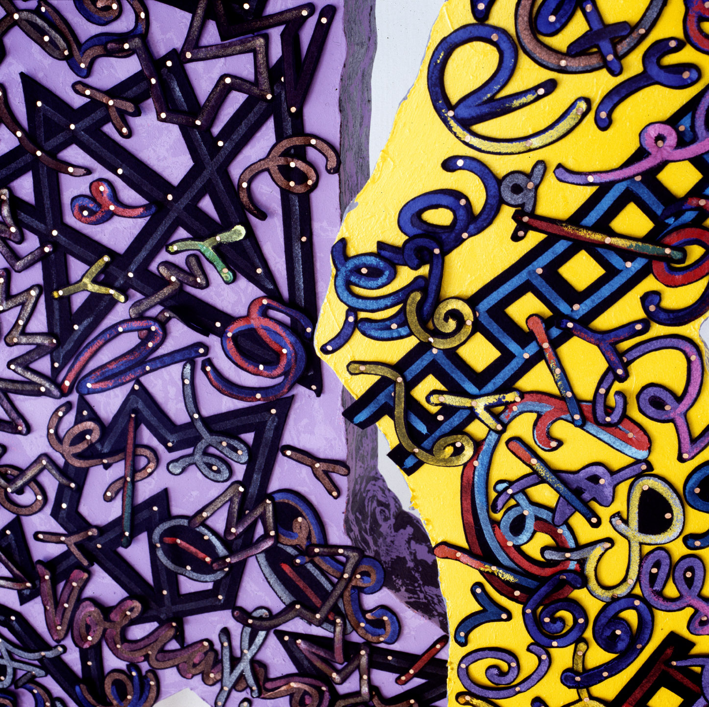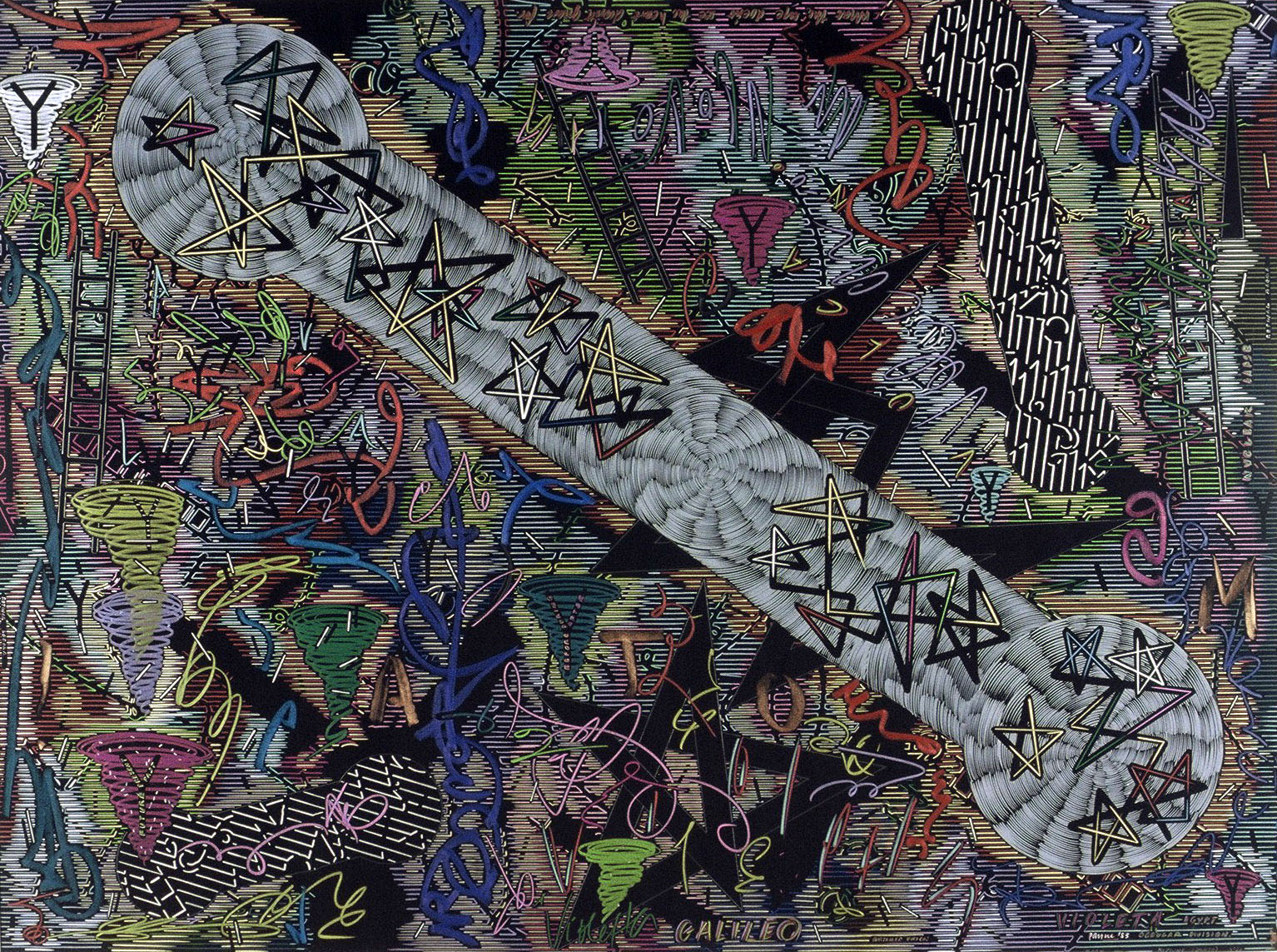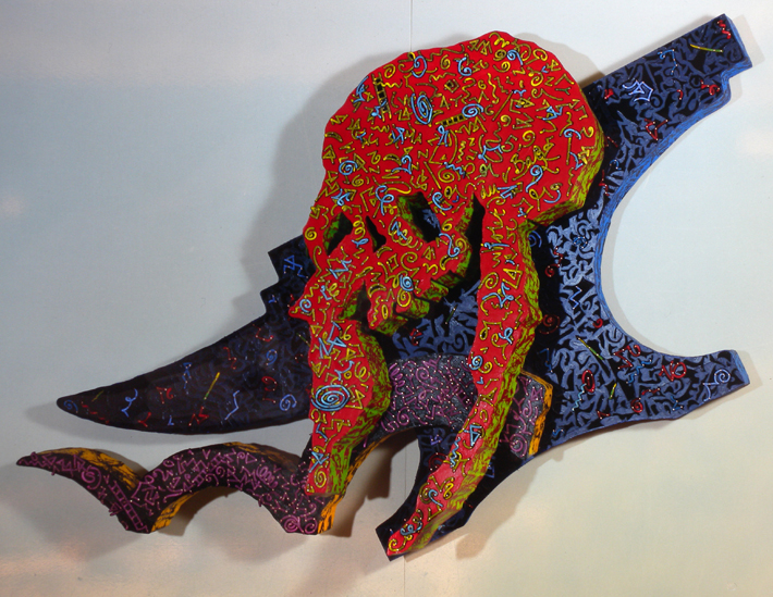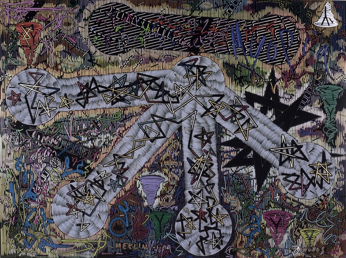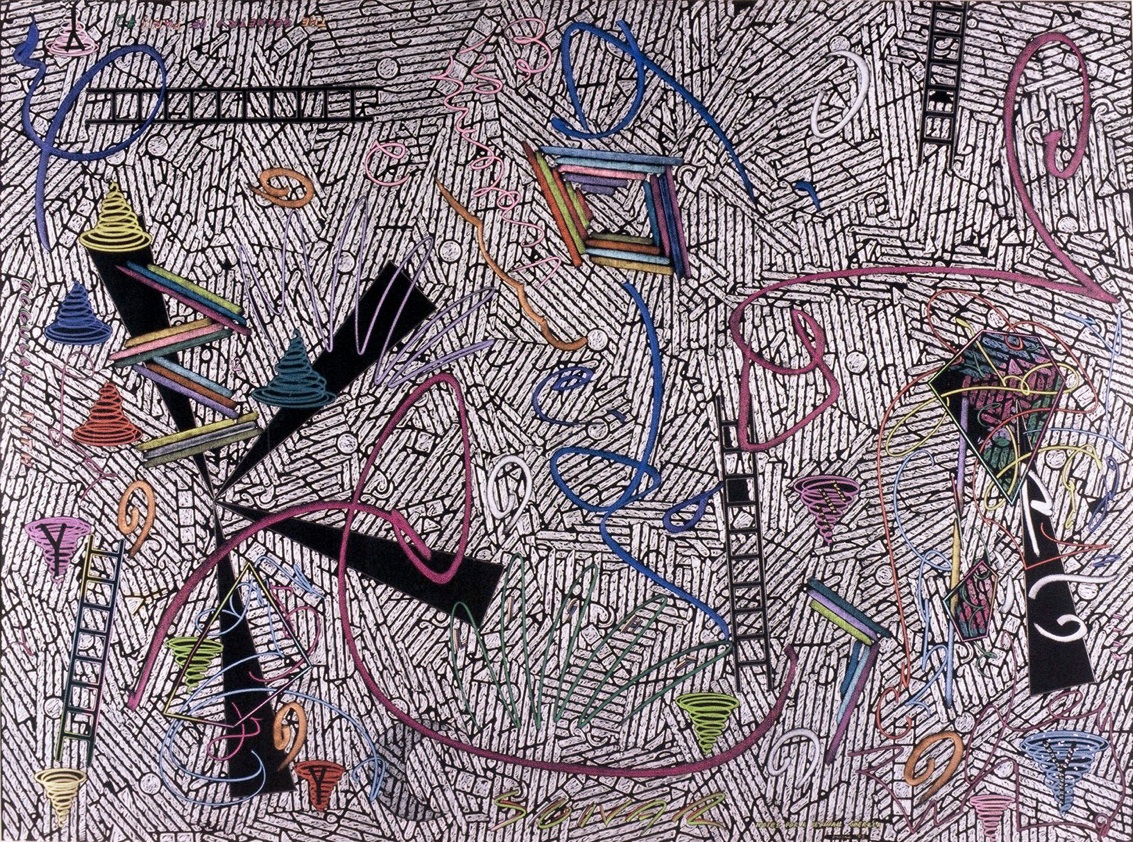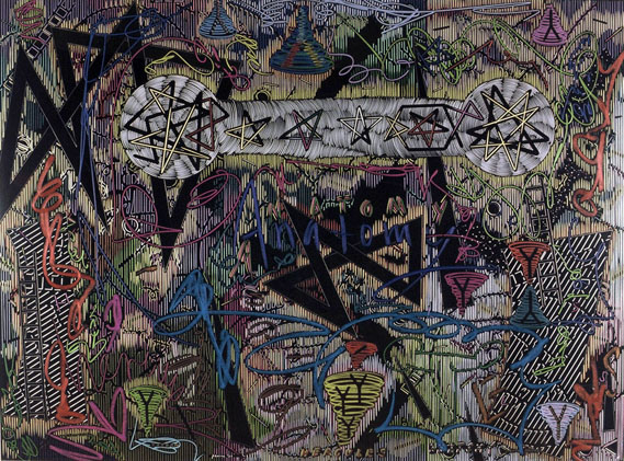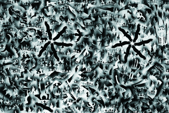 Exhausted by the material and optical complexity of the Stacked Relief works Payne decided to move to simple materials, in this case hand cut paper stencils and matt black spray can paint. Much of his iconographic tokens remain in these works however he expands the industrial motifs to include medieval symbols. The spatial geography implies the viewer inhabits both a conventional and ariel prospect position in a chaotic apocalyptic landscape.