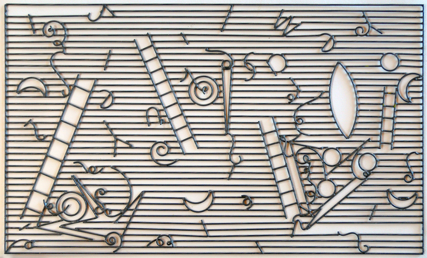 Black Drawings: 1980 - 1983Payne devised a number of soldered wire drawings to act as stencils or drawing aids in the production of the majority of the casein and aquarelle works. Mark making occurred between the open spaces and single line marking on either side of the grid.