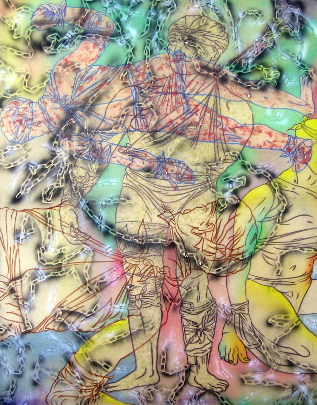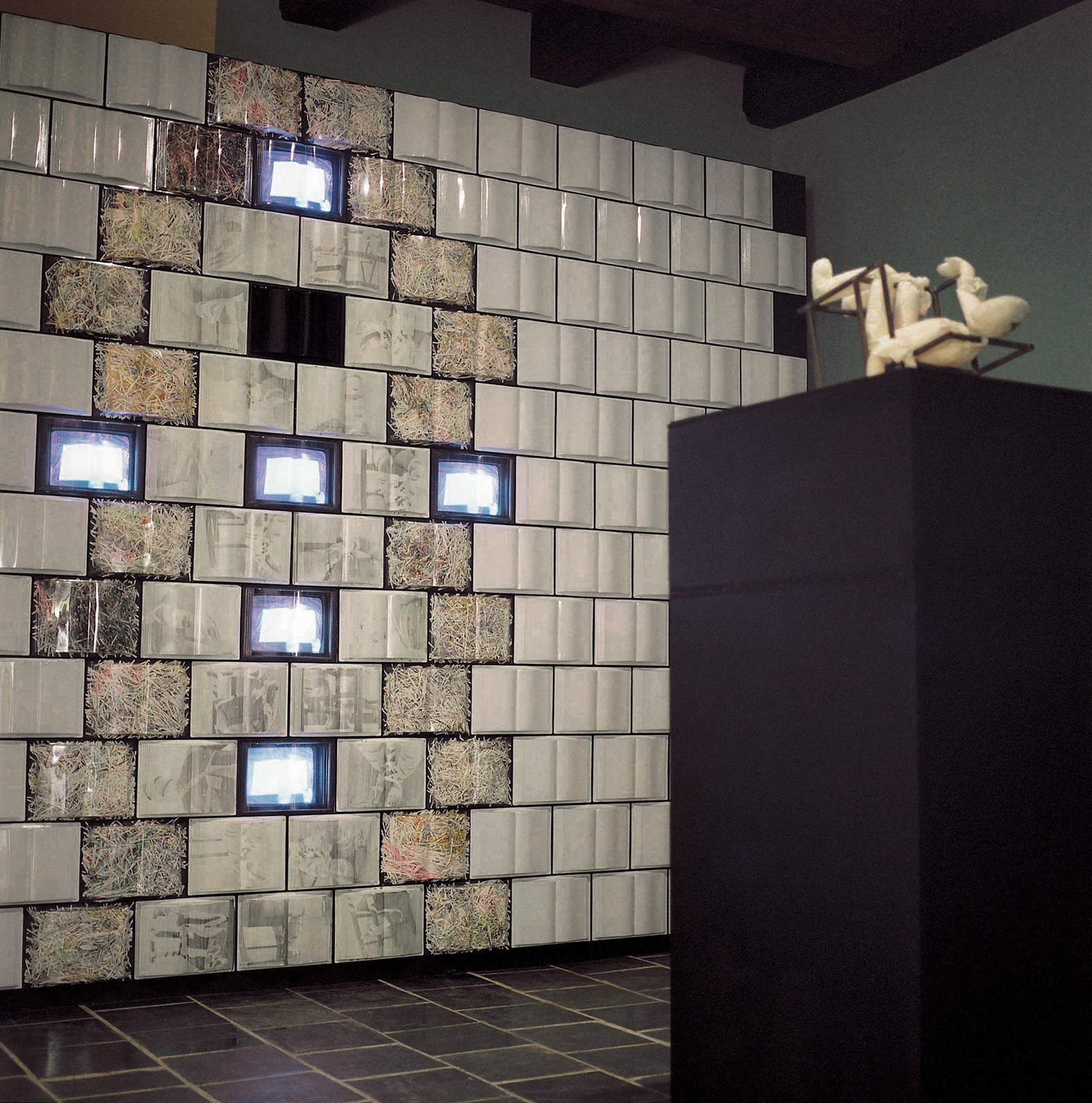 Payne chose to represent torture and the shredding of evidence in a multi-media installation that include a commissioned sound track by Warrick Swinney (Warrick Sony), television monitors, motorized puppet and vacuum-formed book forms, some with photographic images of a male bound to a chair.