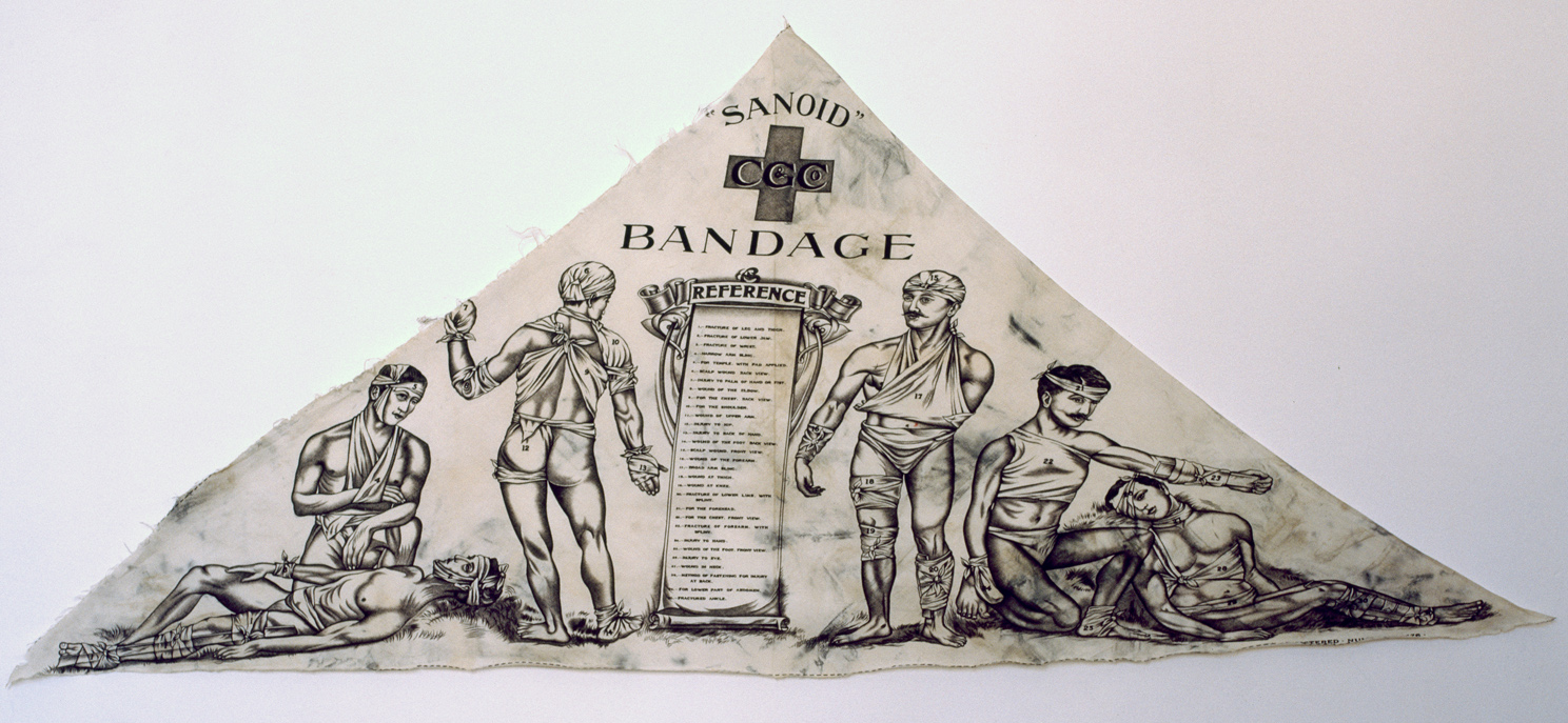Some of the early paintings and etchings are informed by a Sanoid Bandage that enacts its use in a series of printed images of the techniques of bandaging injuries.