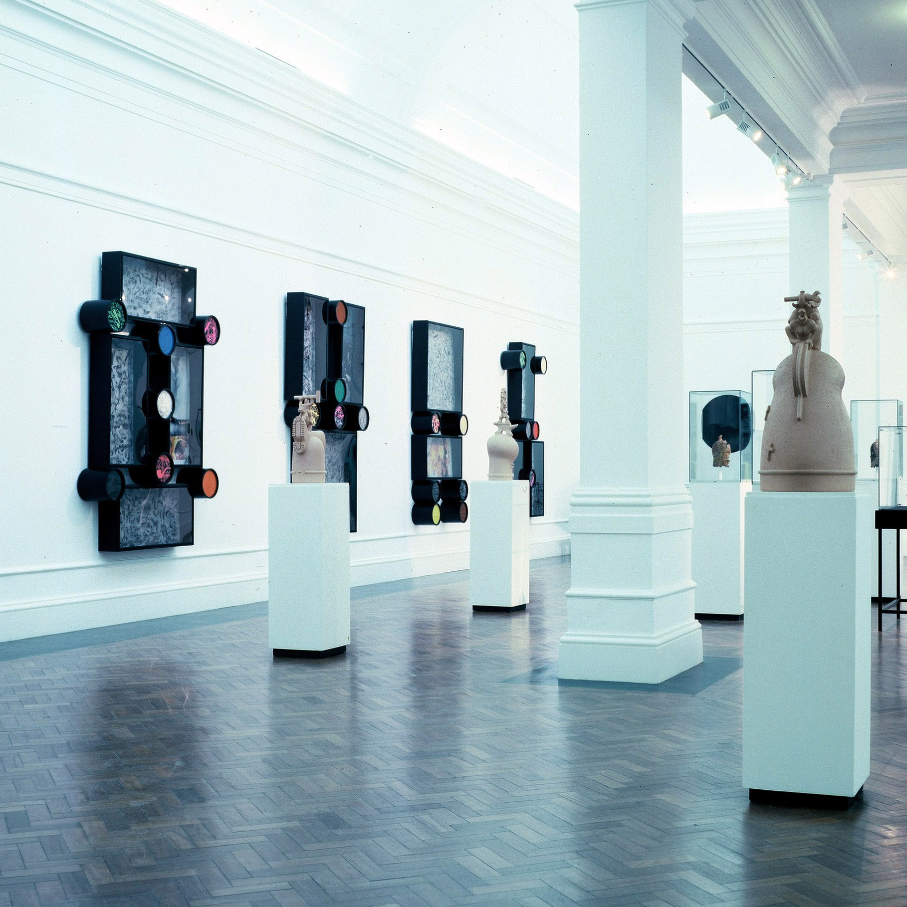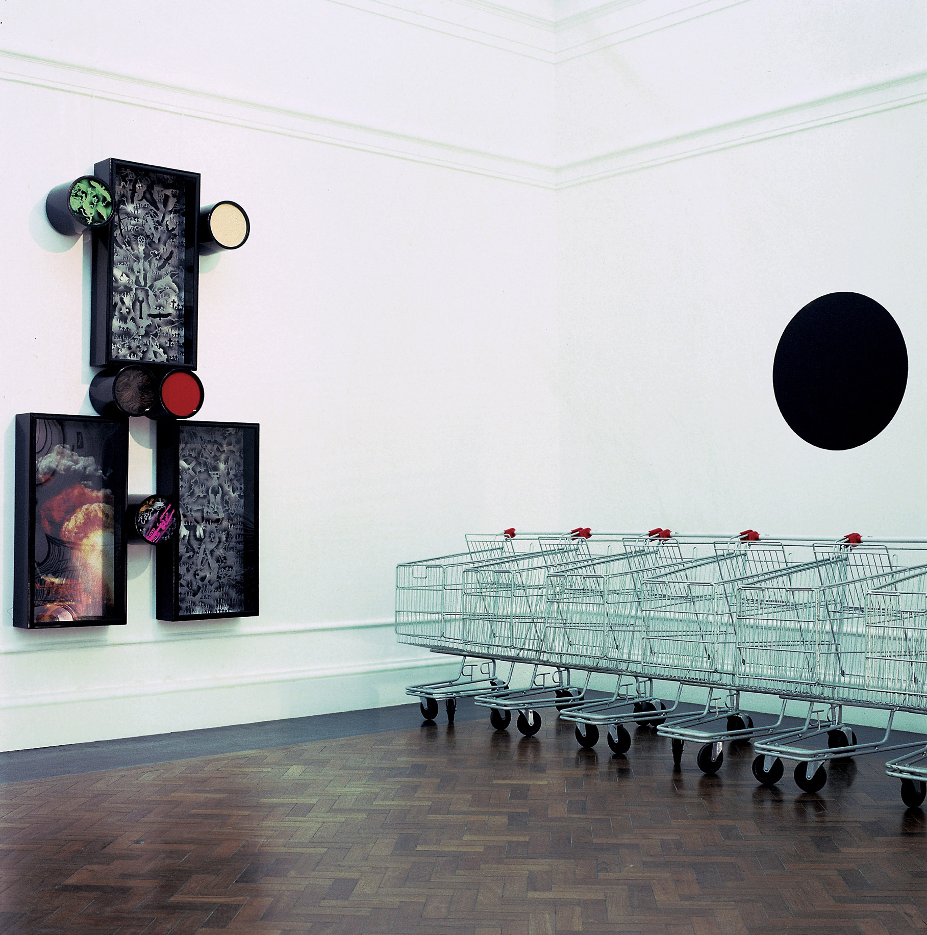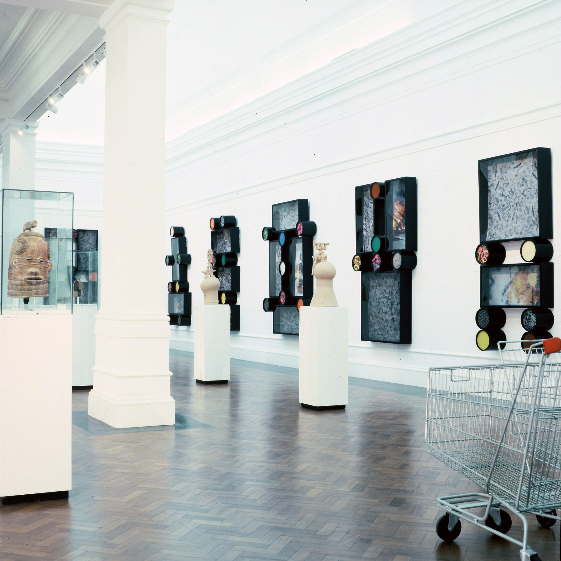 Installation views: Face Value: old heads in modern masks. The exhibition included seven supermarket trollies, a large black dot painted on the west wall, seven wall mounted vitrines (all estroyed), The Lydenburg Heads, the Mafikeng Heads and 14 etchings.