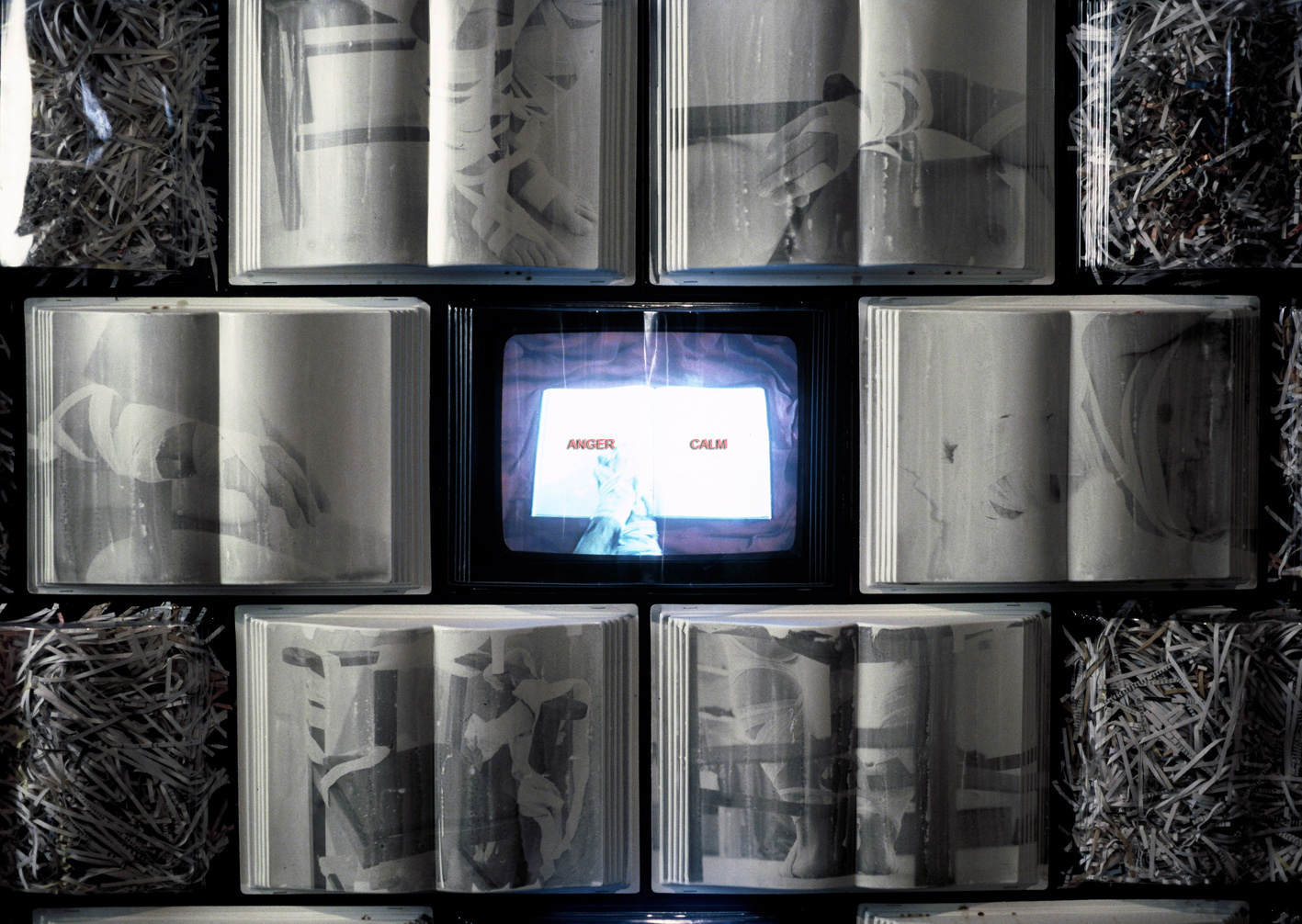 Each monitor shows bandaged blackened hands turning blank pages of books. Binaries intermittently float above the pages: anger/calm, love/hate, mother/father, and so on.