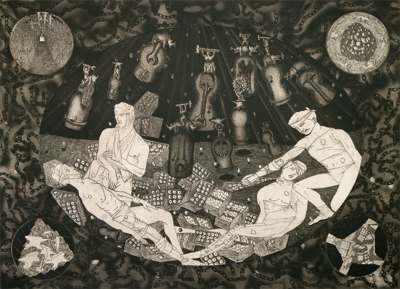 Oppenheimer seduces Foucault. 1990. Etching and aquatint.