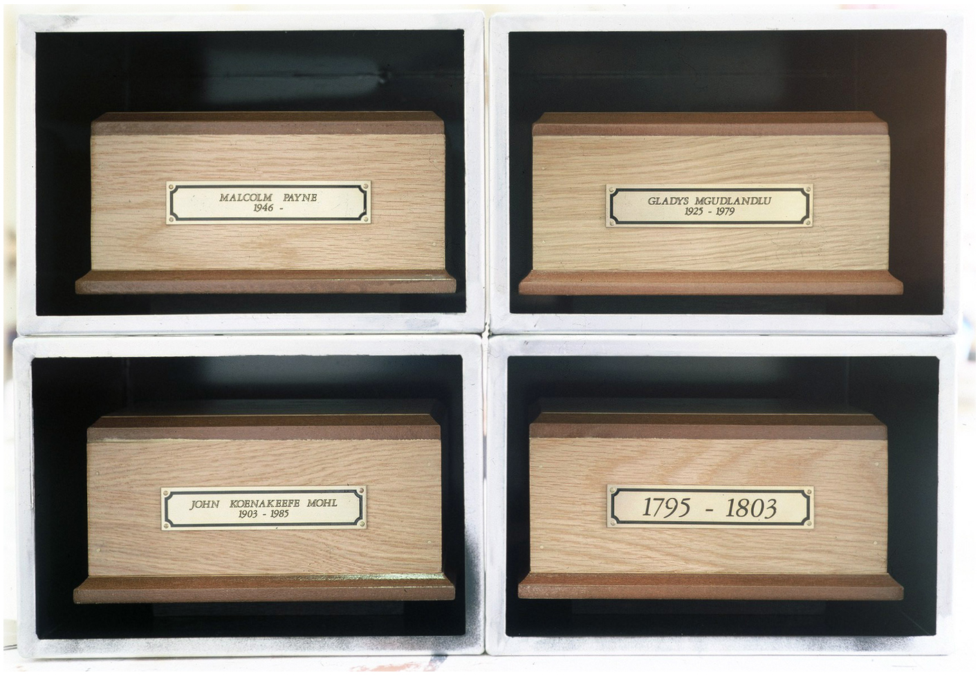 Venice Biennale, 1995.Following on from Mistaken Identity Payne constructs three walls at the gates to the Biennale gardens in Venice (see chronology for more detail).The walls contain forty two glass fronted funerary urn inclusions, six of which are commissioned. Brett Murray, Randolph Hartzenberg, Kagiso Pat Mautloa and Payne make two each. The rest are named after black South African artists who are dead. Donald Judd, Picasso and Pollock are included.Christiaan Boltanski contributed a peculiar irony with his work that plastered the front of the Italian pavilion. He stenciled the names of all the artists that had exhibited since the advent of the biennale on its facade. I did not see Cecil Skotnes however. Payne's work named most of the South African artists that never had the opportunity to represent their country at this event.