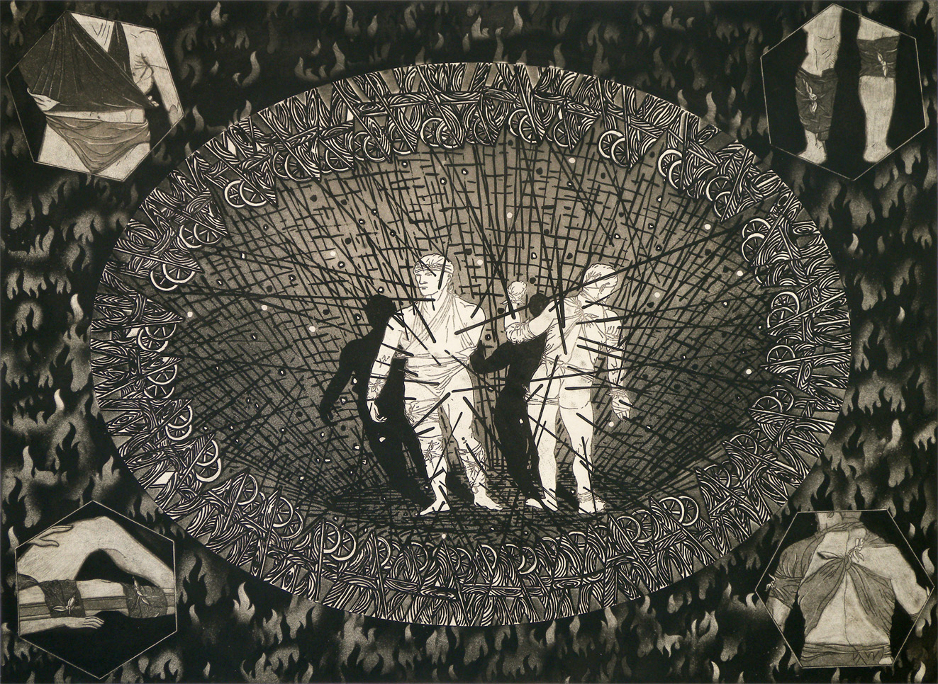 Oppenheimer seduces Foucault. 1990. Etching and aquatint.